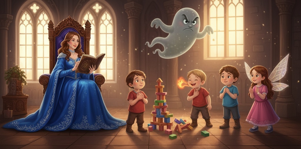 V tej chvíli do komnaty vstúpila Kňažná Ivica. Kráčala potichu, jej kráľovské modré šaty jemne šušťali o kamennú podlahu. V rukách pevne zvierala svoju Zlatú knihu snov. „Nič sa nedeje, moji drahí učni,“ povedala hlasom, ktorý hladil ako teplý vankúš. „Hnev je ako búrka – príde, rozbije pár vecí, ale my vieme, ako ho utíšiť. Naučím vás Kúzlo Skrotenia draka Hnevu.“